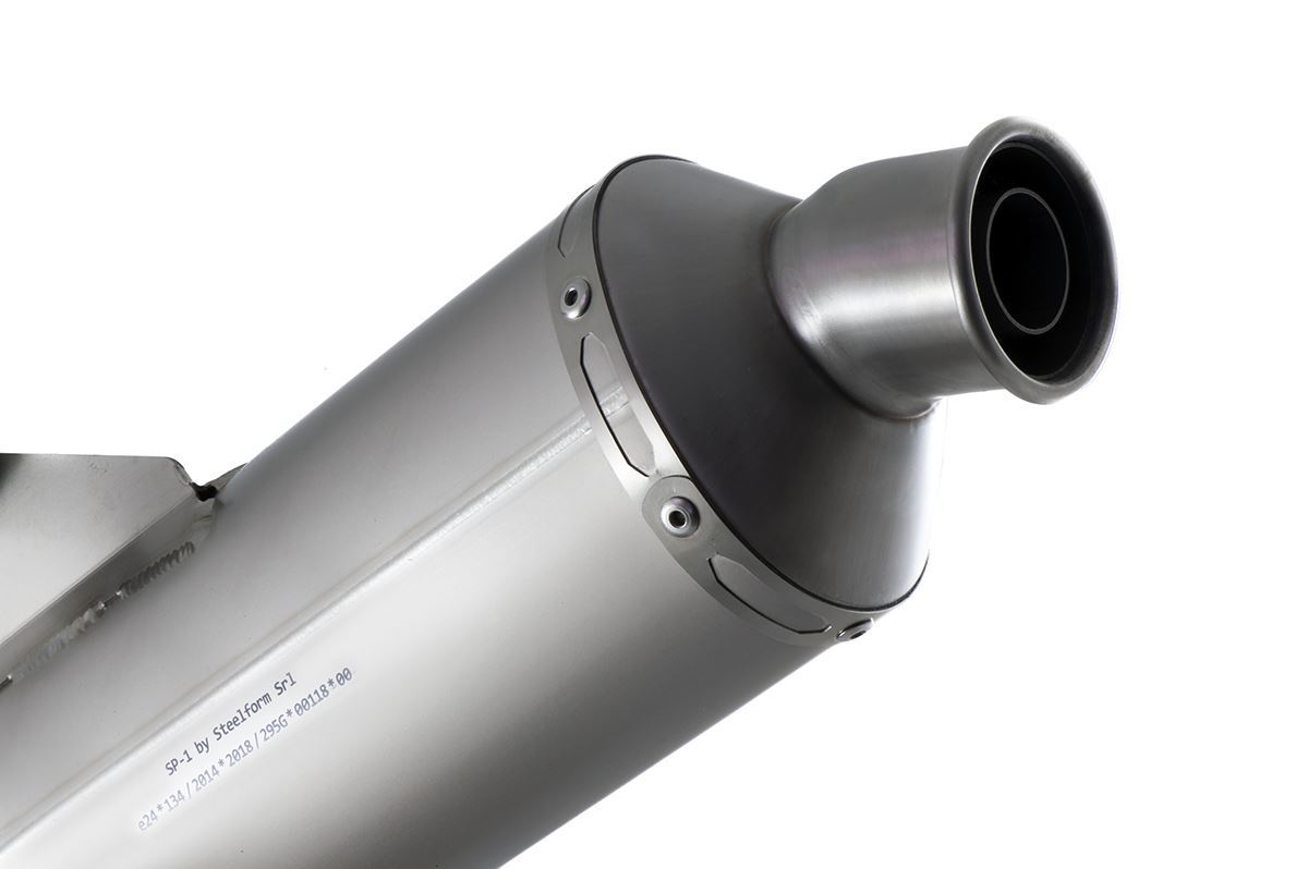 SP-1マフラーは、レーザー刻印されたHP CORSEロゴが入った350mmチタンスリーブ、軽量な円錐型エンドキャップ、そしてリーンアングルで溶接のない独自のエキゾーストアウトレットを特徴としています。