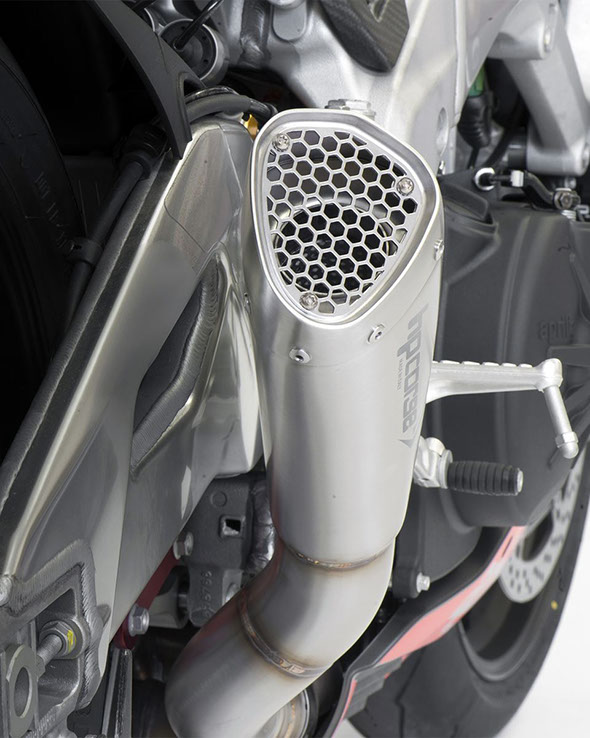 HYDROFORM SHORT Rには、オリジナルのヘッダーに適用される手作業によるTIG溶接スリップオン接続が装備されており、斜めカットの最終エンドキャップと、完璧なMoto GPスタイルで3本のネジで固定された取り外し可能なメタルメッシュがあります。