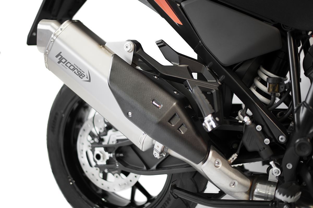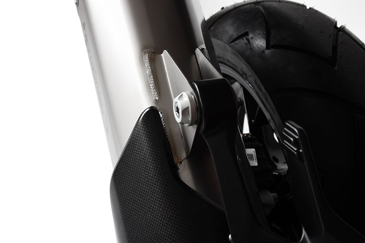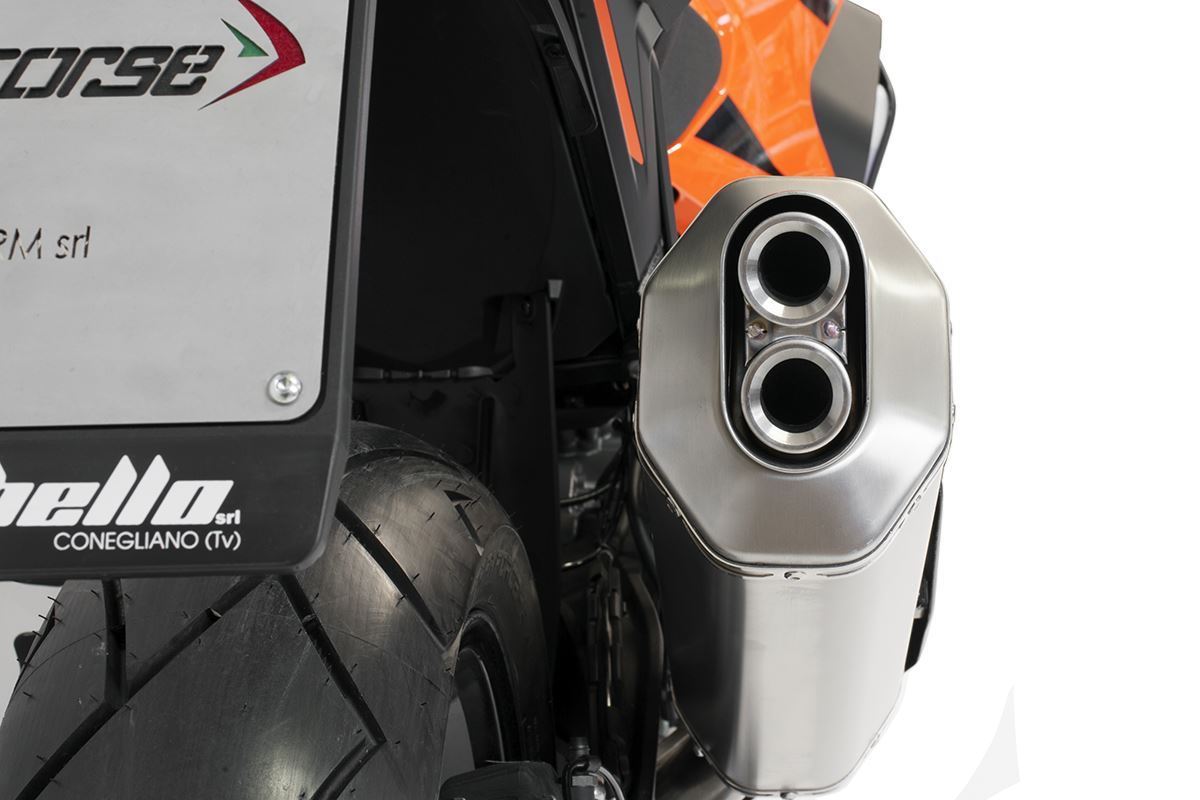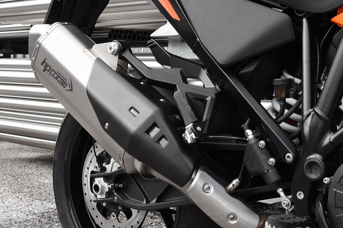 八角形の形状、カーボンカバー、ハイドロフォーム加工されたスパウトにより、オーストリア製エンデューロバイクのリアエンドにラリーキャラクターを与え、パワフルなVツインエンジンもパワーとデリバリーが向上します。
