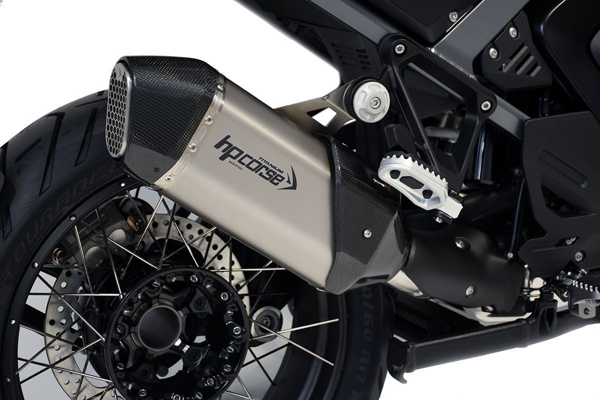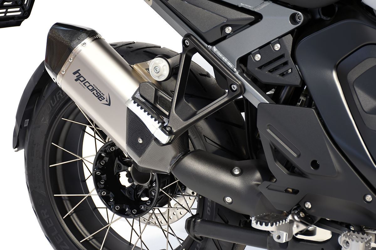 同じくカーボン製のカバーは、リアエンドキャップのスタイリッシュなレイアウトを踏襲し、サイレンサーにラリー仕様の個性を与え、ロングツーリングやアドベンチャーシーンを彷彿とさせます。