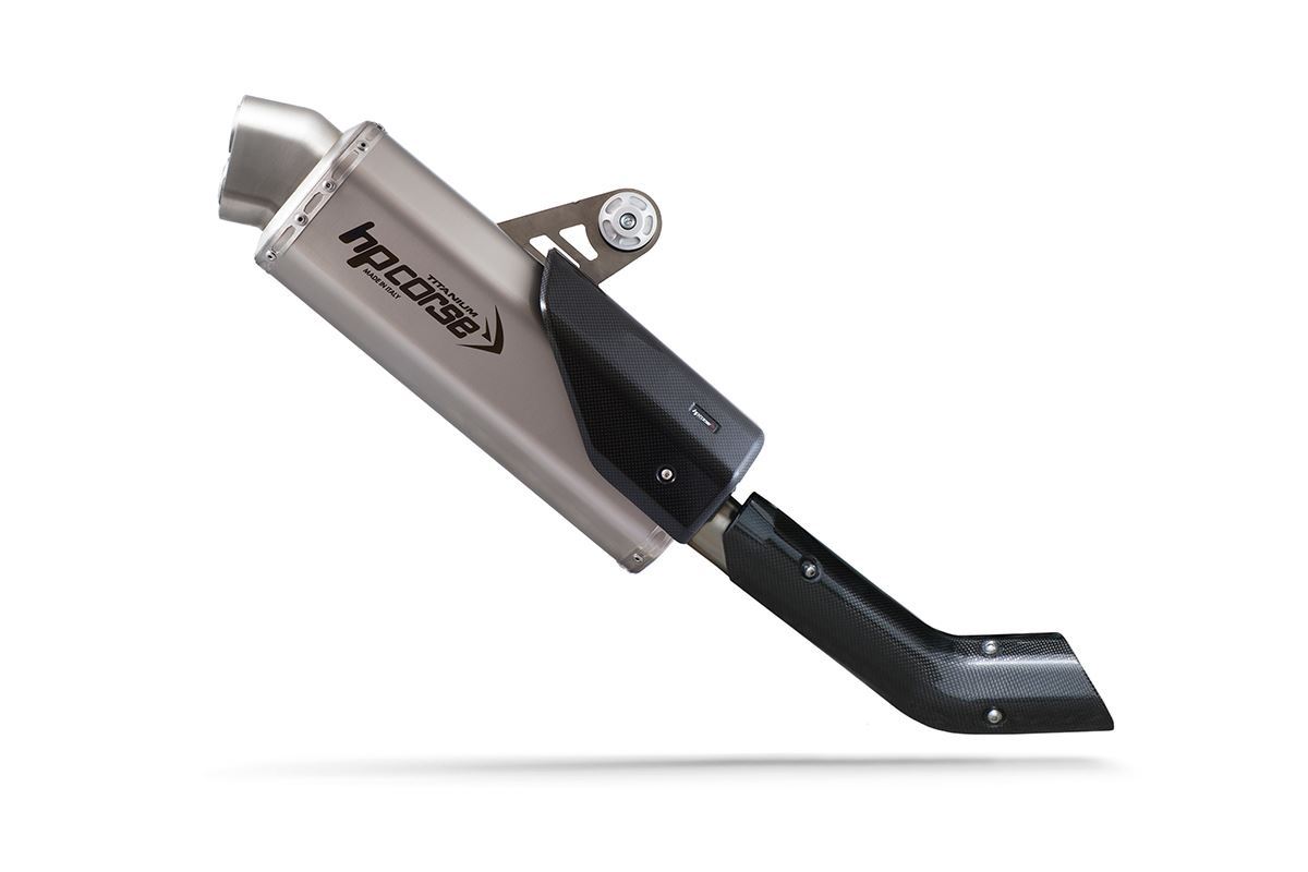 4-TRACK R は、Euro 5 の承認を受けており、カーボン ヒート シールド、スリップオン フィッティング、八角形の底部、溶接なしの液圧成形スパウト、HP ロゴ付きのサイレンサー ボディを備えています。