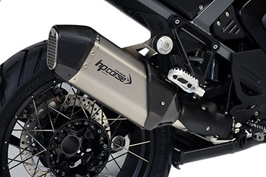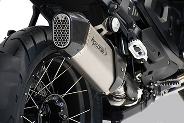 同じくカーボン製のカバーは、リアエンドキャップのスタイリッシュなレイアウトを踏襲し、ロングツーリングやアドベンチャーシーンを彷彿とさせるラリー仕様のマフラーとなっています。