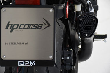 Euro 5 承認済み、手動で TIG 溶接されたサポート ブラケット、ソリッドから機械加工されたフィッティングへのカップリング ブッシング、およびレーザー刻印された HP CORSE TITANIUM ロゴを備えています。