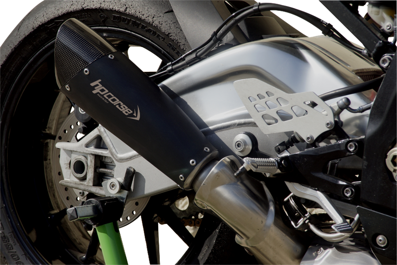 サイレンサー ボディはチタンまたはステンレス スチール (サテンおよびブラック サテン)、真新しいカーボン ファイバー エンド キャップは、サイレンサー ボディに接する部分が傾斜したプロファイルを持つ先細りのダイヤモンドの形をしています。