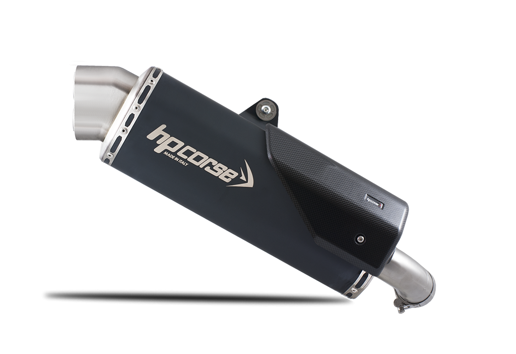 HP CORSE エキゾーストには、レーザーで刻印されたロゴ、3 つの異なる素材 (チタン、サテン スチール、ブラック セラミックス スチール) で利用可能なサイレンサー ボディがあり、八角形の底部と、溶接または炭素繊維のないハイドロフォーミングされたスパウトを備えています。